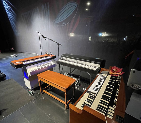 JPJ could afford any gear he wanted, and had a truck and rodies to move and setup grand pianos if he wanted them at every gig. I do not. One requirement of this gig is for the keyboard gear to be as light and compact as possible. I manage to get most of this stuff into 2 cases weighing 50lbs each, and check them in when flying to gigs outside of California. As of 2023 I have switched to in-ear monitoring and lighter/foldable controllers and vintage-style keyboard shells (some of which can fly with me), and this has turned out to be a great sounding and compact set-up, with all of the correct Zep key sounds at my disposal.