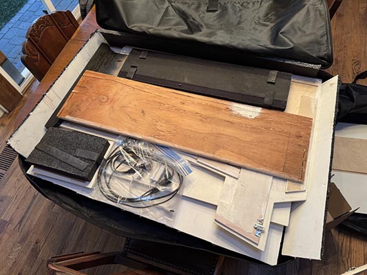 I then had to build the feet and added 2x4 height extensions in order to (just) fit my imitation Moog MOOF bass pedals (so I can play RAIN SONG and KASHMIR from the Mellotron as did JPJ). I finally tracked down a suitable case, a hybrid Gator flat panel LCD/LED bag, which I'm betting will be fine for airline handling once all the parts are packed flat and strapped into the bag. Total weight with the intrument, bag and a light cordless screwdriver to assemble and disassemble is 49lbs!